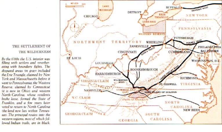 In the scene below a traveler enters a trail on the extreme eastern edge of the Allegheny mountains northwest of Philadelphia and then travels on a long route in a southwesterly direction along the lines of the Allegheny mountain ridges to Tennessee finally breaking through into Kentucky at the Cumberland Gap.