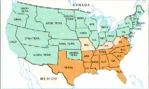 CIVIL WAR MAP. UNION STATES ARE IN GREEN, CONFEDERATE IN BROWN. SPLIT STATES ARE IN TAN